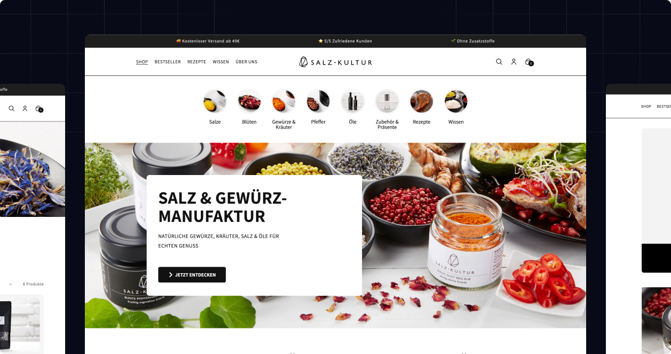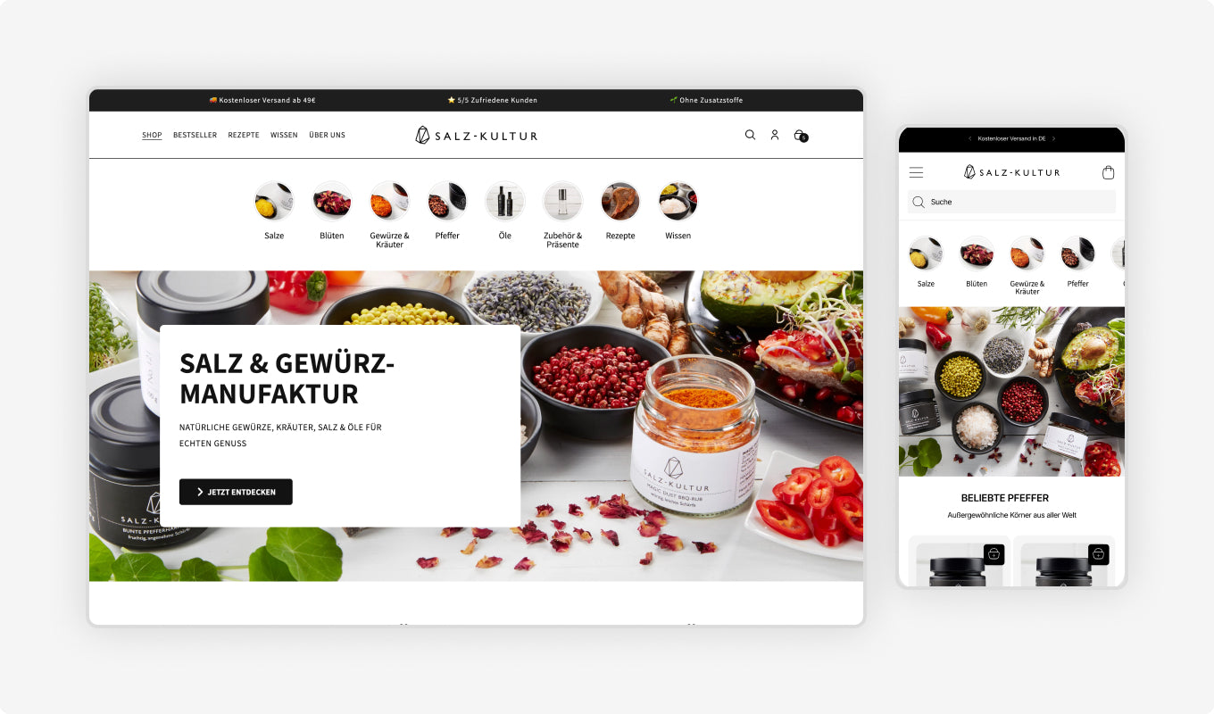 Der Shop von Salz-Kultur von Harald Baecker lief auf einer veralteten Shopware-Version. Das führte nicht nur zu spürbaren Einbußen bei der Conversion, sondern auch zu einem insgesamt altbackenen Erscheinungsbild, das der Marke nicht gerecht wurde. Zudem war die technische Wartung sehr teuer: Für jedes Update oder jede Erweiterung musste ein externer Entwickler beauftragt werden, was hohe Zusatzkosten verursachte.